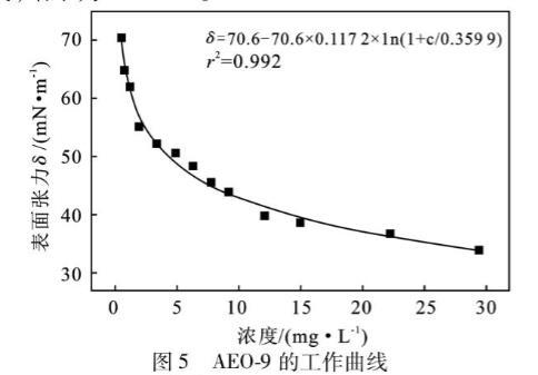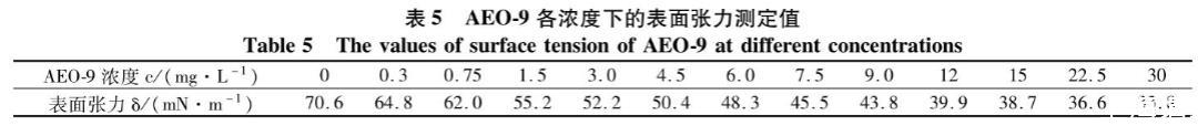 脂肪醇聚氧乙烯醚(AEO-9)是一種非離子表面活性劑,該類表面活性劑是非離子表面活性劑中發(fā)展最快、用量最大的品種。AEO-9試樣的表面張力測定結果見表5。