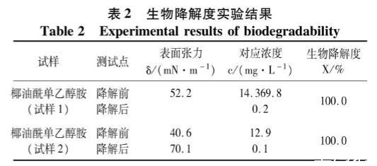 不同批次的椰油酰單乙醇胺試樣經過降解后利用表面張力法測定其降解液的表面張力值,根據(jù)生物降解度公式計算得出降解度,測定結果見表2。其中空白降解試驗液降解前與降解后的表面張力值分別是69.5、68.2mN/m,而試樣溶液在降解后測定的表面張力值均大于空白降解試驗液降解后的表面張力值68.2mN/m,導致帶人工作曲線計算出的降解后試樣溶液的濃度(c終)小于降解后空白降解試驗液的濃度(c空),根據(jù)公式要求,當c終小于C空時,差值以零計,因此最終計算出的生物降解度為100.0%。