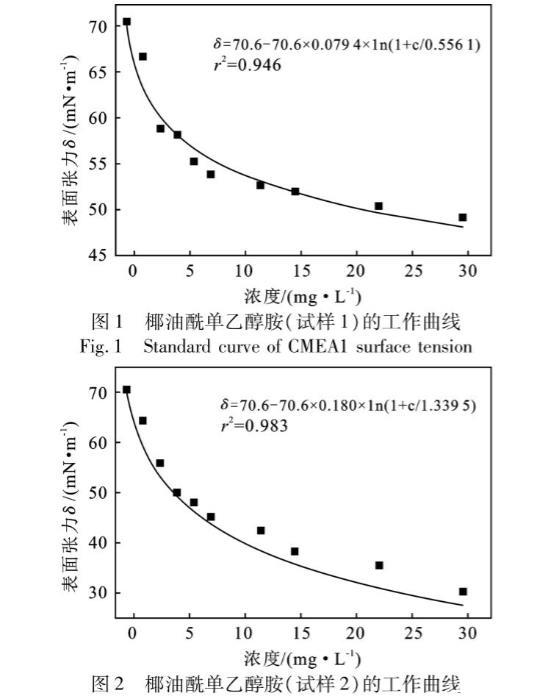 選擇2個不同批次的椰油酰單乙醇胺試樣按照工作曲線的繪制方法繪制表面張力工作曲線。通過測定不同濃度的椰油酰單乙醇胺溶液的表面張力,制作濃度和表面張力的c-8的散點圖,再根據(jù)希斯科夫斯基經驗公式利用Origin軟件做c-8散點圖的擬合曲線,得到該公式的相關參數(shù),得出擬合公式及工作曲線。