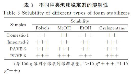 聚氨酯發(fā)泡過程中,各原料之間的相容性對(duì)泡沫的性能有重要影響。相容性好的原料可以確保發(fā)泡過程中的化學(xué)反應(yīng)順利且充分進(jìn)行,從而獲得均勻、細(xì)膩的泡沫結(jié)構(gòu),提高泡沫的物理性能和使用性能。表3是不同種類泡沫穩(wěn)定劑在不同溶劑中的溶解性測試,通過測試結(jié)果可知,經(jīng)過接枝改性后的PAVE-5和PGVF-6在多元醇和環(huán)戊烷中的溶解性較好,和國產(chǎn)-1、進(jìn)口-2等泡沫穩(wěn)定劑都能夠很好的溶解在多元醇和環(huán)戊烷中。PGVF-6和PAVE-5在多元醇中表現(xiàn)出的優(yōu)良溶解性主要得益于POSS接枝的APEG鏈段的醚鍵和羥基都具有明顯的極性,這使得其分子間以及與其他極性分子間可以形成較強(qiáng)的極性相互作用。這種相互作用有助于分子間的相容性,對(duì)聚氨酯泡沫的形成和性能有積極作用。