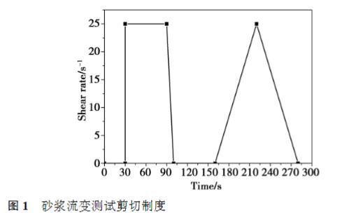 砂漿的流變測(cè)試使用Brookfield R/S SST2000流變儀,將測(cè)試流動(dòng)度之后的砂漿立即置于流變儀中,選定設(shè)置好的剪切制度后開始測(cè)試,剪切制度設(shè)置如圖1所示。具體過程描述如下:靜置30s后,在剪切速率25s?1下勻速預(yù)剪切60s;然后剪切速率在10s內(nèi)勻速下降至0s?1;靜置60s后,剪切速率以斜坡式在60s內(nèi)逐漸從0s?1提高至25s?1,然后再以斜坡式在60s從25s?1下降到0,采集60個(gè)數(shù)據(jù)點(diǎn)。采用剪切速率從25s?1下降到0s?1的過程中的屈服應(yīng)力和表觀黏度作為分析砂漿流變性能的數(shù)據(jù)。