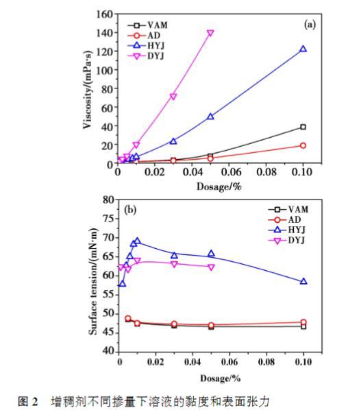 相同摻量下,DYJ的黏度最高,其次是HYJ,VAM和AD黏度在低摻量下接近,摻量達(dá)到0.10%之后,VAM黏度高于AD;VAM和AD的黏度隨著摻量的提高緩慢增大,而HYJ和DYJ溶液的黏度隨摻量的提高迅速提高,尤其是DYJ的增長(zhǎng)幅度更為顯著。總體來(lái)看,增稠劑分子量越大,相同摻量時(shí)溶液的黏度越高。從表面張力的結(jié)果來(lái)看,相同摻量下,HYJ溶液的表面張力最高,其次是DYJ,VAM和AD的表面張力顯著低于其他兩種增稠劑,且AD略微高于VAM.