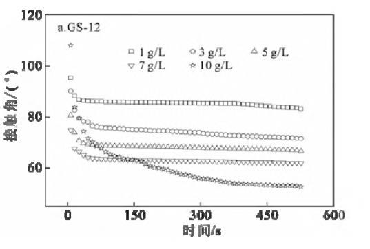 在KBr濃度區間1~10 g/L內,GS-12隨著KBr濃度的增加,接觸角顯著減小,而GS-16和GS-18則變化不明顯??梢越忉尀?對于GS-12而言,KBr濃度越高,固/液界面處的填料越緊密,導致氣/液固界面張力值降低,而疏水鏈較長的GS-16和GS-18其自身降低界面張力的能力有限,所以,隨KBr濃度增加,接觸角變化有限[1,19]。此外,隨著KBr濃度的增加,液滴在石蠟膜上的接觸角值減小。