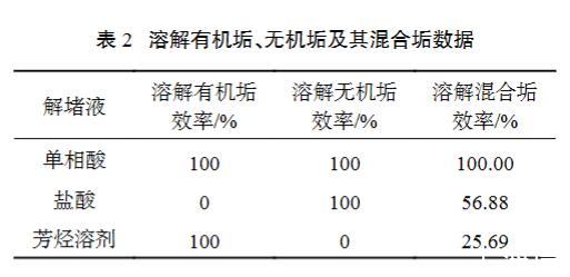 分別對鹽酸、芳烴溶劑、單相酸溶解有機垢、無機垢及其混合垢性能進行測試。實驗條件:90℃水浴,50 g溶液,2.5 g垢樣,溶解4 h,實驗結果見表2。從表2可以看出,單相酸對混合垢溶解效率遠高于單一解堵體系,具備同時解除有機垢、無機垢及其混合垢的能力。單相酸溶有機垢和無機垢過程圖片見圖9,當碳酸鈣加入后,單相酸與碳酸鈣反應較明顯;當瀝青加入后,常溫下溶解較慢,90℃水浴4 h后完全溶解;溶解后的殘液倒出后,燒杯底部無殘留,表明單相酸可以完全溶解有機垢(碳酸鈣)和無機垢(瀝青)。