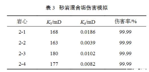 在該實驗方案下,交替注入的碳酸鈉溶液與氯化鈣溶液會在孔隙中形成白色的碳酸鈣沉淀,瀝青飽和進入孔隙中經過正庚烷的揮發瀝青黏度急劇增加,封堵孔隙造成滲透率下降,可以模擬混合垢傷害砂巖儲層。由表3可見,獲得的砂巖混合垢傷害率大于99%,傷害后巖心滲透率小于0.02 mD,傷害顯著。