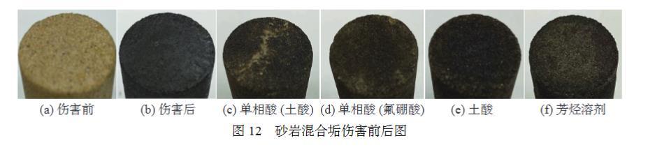 實驗模擬改變單相酸的酸相(土酸、氟硼酸)與土酸和芳烴溶劑進行對比實驗,實驗結果見表4。巖心傷害前后及采用不同體系解堵后的巖心端面照片見圖12。實驗結果顯示芳烴溶劑和土酸只能部分解除砂巖巖心傷害,單相酸體系不僅可以解除有機垢和無機垢傷害,還能酸蝕增滲,使得傷害解除后巖心滲透率高于傷害前巖心滲透率。