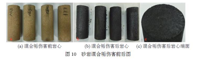 為在室內模擬混合垢巖心傷害,設計如下實驗步驟:①氣測巖心初始滲透率;②模擬無機垢傷害:使用10.5%碳酸鈉溶液與15%氯化鈣溶液交替注入,模擬無機垢(CaCO3)的損害;③模擬有機垢傷害:50%的瀝青正庚烷溶液與二甲苯1∶1混合,抽真空進行巖心飽和,傷害72 h后烘干;④傷害后巖心氣測滲透率;⑤計算傷害率?;旌瞎競η昂笊皫r巖心圖片見圖10。
