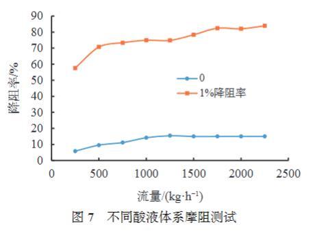 采用摩阻測試儀測定單相酸的降阻率,實驗結果可以看出,在不加減阻劑的情況下,單相酸與水的摩阻相當,表明不加減阻劑情況下,單相酸不具備減阻效果;加入0.1%減阻劑后,可明顯降低單相酸摩阻,降阻率可達80%以上,摩阻和膠凝酸相當,遠低于乳化酸摩阻。
