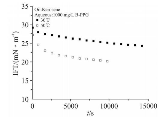 在油田開采過程中,油藏溫度是必須考慮的要素之一。對于分子結(jié)構(gòu)中含聚氧乙烯基團(tuán)(EO)的表面活性劑,溫度升高會破壞EO與水分子形成的氫鍵,增大表面活性劑的油溶性,對界面張力的影響較大。而對于離子型表面活性劑,溫度對界面張力的影響較小。Fig.8示出了1000mg/L B-PPG溶液在30℃和50℃時(shí)的動態(tài)界面張力。由圖可見,在50℃時(shí),體系的界面張力比30℃時(shí)降低了5mN/m左右。B-PPG的水溶性很大程度來源于酰胺基團(tuán)與水分子形成的氫鍵,因此,溫度升高,B-PPG的油溶性增大,界面吸附量有所增加,界面張力明顯降低。