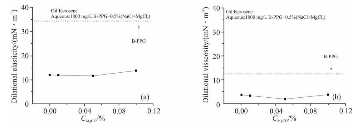 Ca2+濃度對1000mg/LB-PPG溶液界面擴(kuò)張參數(shù)的影響見Fig.7。從圖中可以看出,電解質(zhì)中Ca2+含量增大對界面擴(kuò)張黏性的影響較小;而擴(kuò)張彈性則在低Ca2+濃度條件下略有變化,從12mN/m增大到17mN/m。二價(jià)陽離子能夠與2個(gè)負(fù)電荷發(fā)生靜電吸引作用,因此,可作為“橋梁”,與不同B-PPG分子中的負(fù)電荷發(fā)生作用,增加聚集體結(jié)構(gòu)的強(qiáng)度。Ca2+比Mg2+半徑大,與不同B-PPG分子發(fā)生作用的幾率也大,增大擴(kuò)張彈性的幅度較大。