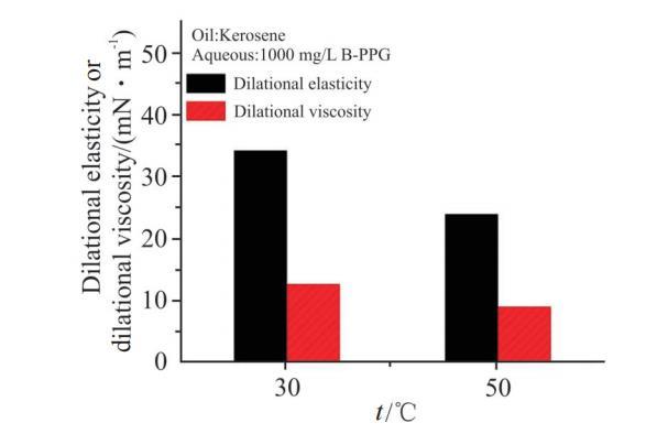 溫度對1000 mg/L B-PPG溶液界面擴(kuò)張彈性和黏性的影響見Fig.9。實(shí)驗(yàn)結(jié)果表明,當(dāng)溫度從30℃升高到50℃時(shí),界面擴(kuò)張彈性和黏性均明顯降低。隨著溫度升高,界面膜變得疏松,同時(shí),B-PPG分子的熱運(yùn)動加劇,擴(kuò)散交換過程變快,上述變化均會造成界面膜強(qiáng)度的降低,50℃時(shí)B-PPG界面膜的彈性和黏性不到30℃的1/2。