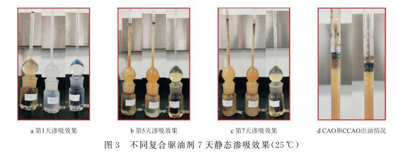 從以上分析來看,降黏增滲型驅(qū)油劑(CCAO和CAO)在靜態(tài)滲吸過程中通過降低原油黏度,提高了巖心原油的流動(dòng)性及滲吸能力,其中CCAO滿足中黏原油滲吸驅(qū)油要求,靜態(tài)洗油率達(dá)到15.27%,且析出的原油不乳化,在實(shí)際生產(chǎn)過程中無需后續(xù)的破乳處理。