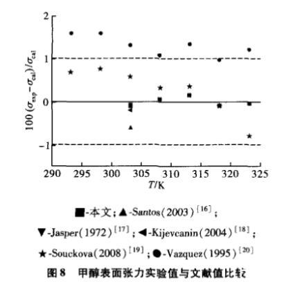 圖8為甲醇表面張力實驗值擬合得到的方程與文獻實驗值的偏差,本文數據與Santos等[15],Jasper[16],Kijevcanin等[17]和Souckova等[18]數據吻合得較好,與Vazquez等[19]數據偏差稍大,最大偏差為1.6%。