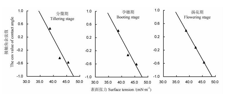 通過Delta-8表面張力儀直接測定,分蘗蘗期、孕穗期、揚花期水稻葉片的臨界表面張力值分別為34.46、34.36和34.33 mN/m。結果如圖2所示,清晰展示了不同生育期的差異。