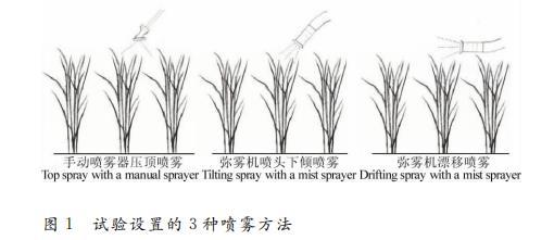在水稻分蘗蘗期、孕穗期和揚花期分別采用如圖1所示的3種噴霧方法進行試驗,其中彌霧機噴頭下傾噴霧方法霧流方向角約為45^{circ}(垂直向下為0^{circ})。每種噴霧方法分別噴灑用清水和100mg/L TX-10溶液配制的2000mg/L麗春紅-G溶液。