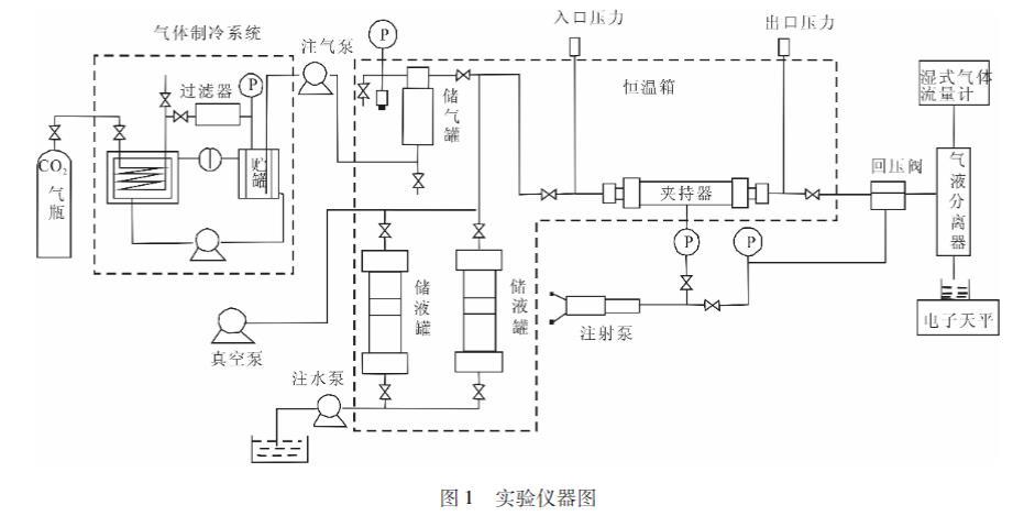 實驗所用裝置為地質封存條件下CO2遷移物模擬平臺,如圖1所示。主要結構分為以下幾個系統:氣體制冷系統、氣體注入驅替系統、液入驅替系統、回環壓系統、巖心夾持系統、量系統、抽真空系統及數據采集和微機測控系統等。CO2氣體經氣體制冷系統冷卻后通過注氣壓注入儲氣罐,最大注入壓力20MPa。液體現,通過注水泵恒流注入儲液罐,最大注入流量為9.9ml/min。通過注射泵設置回、環壓。儲氣罐和儲液罐通過出氣、出液閥門將CO2、液體括注入巖心夾持器。通過真空泵對巖心抽真空。口端的氣體、液體通過氣液分離器分離,氣體通過濕式氣體流量計記錄瞬時和累計流量,體通過電子天平稱重的方式記錄其瞬時和累g計流量。瞬時的入口、出口壓力通過計算機記秦玉錄。儲氣罐、儲液罐、巖心夾持器都放置于恒溫況箱內,通過恒溫箱控制其內部溫度,范圍為室溫至120℃。