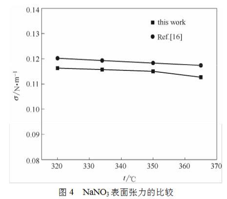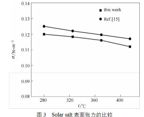 在此基礎上,對單組分NaNO3和混合熔鹽Solar salt(60%NaNO3+40%KNO3,質量分數)的表面張力進行驗證。Solar salt和NaNO3的表面張力測量結果分別與文獻中的值比較,結果如圖3和圖4所示。