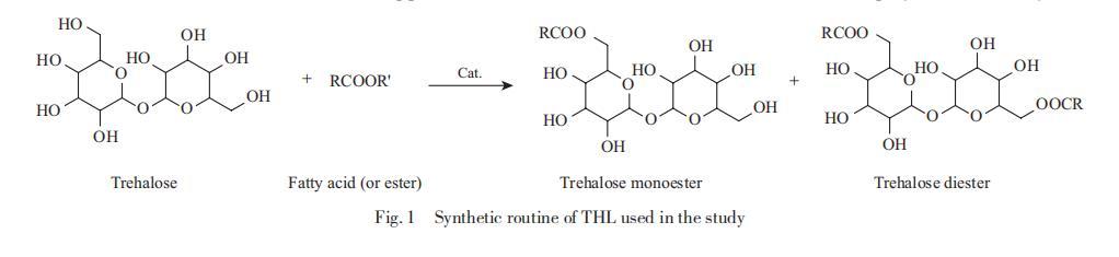 海藻糖脂(THL)是一種含有海藻糖親水部分的糖脂,可以降低界面張力并增加疏水化合物的假溶解度。海藻糖脂具有多樣的結(jié)構(gòu)特征,并已用于各種工業(yè)應(yīng)用,例如農(nóng)業(yè)中的生物農(nóng)藥,以及食品工業(yè)中的乳化劑和防腐劑。海藻糖脂在清潔、乳化、發(fā)泡、抗菌活性方面的多功能特性,使其在化妝品中具有多種應(yīng)用潛力。作為糖脂表面活性劑,海藻糖脂由多種微生物產(chǎn)生,其疏水區(qū)域表現(xiàn)出從短鏈到長鏈和復(fù)雜脂肪酸鏈的多種結(jié)構(gòu)。生物合成產(chǎn)率低是生物表面活性劑的常見問題,這阻礙了其大規(guī)模生產(chǎn)。目前,通過化學(xué)合成制備的具有簡單結(jié)構(gòu)的海藻糖脂是生產(chǎn)的更好選擇,本研究中使用的海藻糖脂的合成路線如圖1所示。本研究中使用的海藻糖脂由綠色原料(淀粉、棕櫚油等)通過脂肪酸酯和海藻糖之間的酯交換反應(yīng)制成,利用來自淀粉的葡萄糖和從棕櫚油提取中獲得的脂肪酸(酯)。