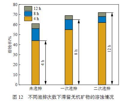 圖12為QPJ-02復(fù)配酸液在質(zhì)量分?jǐn)?shù)為12%、起泡劑質(zhì)量分?jǐn)?shù)為0.6%時(shí),不同循環(huán)間歇泡排次數(shù)下井筒內(nèi)滯留無機(jī)礦物的溶蝕情況。由圖12可知,當(dāng)起泡劑-酸液未經(jīng)過泡排,酸浸12 h后無機(jī)礦物的溶蝕率僅為60.7%,經(jīng)過1次泡排12 h后無機(jī)礦物的溶蝕率為69.1%,經(jīng)過2次泡排12 h后無機(jī)礦物的溶蝕率為72.3%。隨著泡排次數(shù)的增加,無機(jī)礦物溶蝕率逐漸增長,這是由于經(jīng)過泡排作用的氣泡吞吐過程中,酸液與無機(jī)礦物表面作用更加充分,使得泡排作用對溶蝕率起促進(jìn)效果。